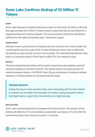 Event: Sonic Labs released an updated tokenomics report on December 24, 2025, confirming that approximately 92.2 million 'S' tokens remain unallocated and are earmarked for a targeted airdrop and incentive program. Show More