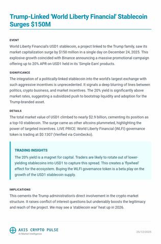 Event: World Liberty Financial's USD1 stablecoin, a project linked to the Trump family, saw its market capitalization surge by $150 million in a single day on December 24, 2025. Show More