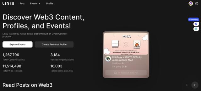 Link3 name card + event announcement/participation platform, incentivized by W3ST, powered by Cyber connect protocol. Show More